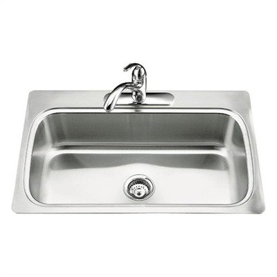 K-3373+1 Faucet Mount: 1 hole Photo shows kitchen sink with three-hole faucet punching and strainers. (Not Included) Features: -Available with 1, 3 or 4 hole faucet punchout.-Accessories not included.-Made with 18-gauge stainless steel.-SilentShiled provides noise reduction.-Water depths: 8''.-Available separately in: vibrant brushed nickel, vibrant brushed bronze, brushed chrome, vibrant stainless.-Kohler ceramic disc valves exceed industry longevity standards two times for a lifetime of durable performance.-High-temperature limit stop allows you to preset a comfortable maximum temperature to eliminate scalding.-MasterClean sprayface that resists mineral buildup and is easy to clean.-Optimal height and reach provides great clearance beneath the spout.-Flexible stainless steel supplies simplify installation.-For use with Staccato double equal sink.-Ideal for kitchen workstation.-Fits: Verse kitchen sinks K-3371, K-3372 - small basin; K-3180, K-3181 - small basin.-Cushions fragile dishes and protects the sink's basin. Options: -Low-flow aerator option available. Construction: -Hardwood construction. Color/Finish: -Polished chrome finish.-Stainless steel finish. Specifications: -Backordered 1-2 weeks. Dimensions: -Overall dimensions: 8.25'' H x 33'' W x 22'' D.-Overall dimensions: 11.81'' H x 8'' W x 11.25'' D..../ Verse Single Basin Self-Rimming Kitchen Sink Faucet Mount: 1 hole / Plumbing Sinks